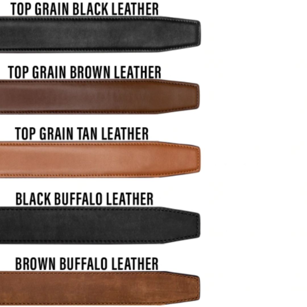 - Top Grain Leather with our proprietary Reinforced Power-Core™ center for strong support & stiffness. Buckle styles differ but mechanism and function is the same.