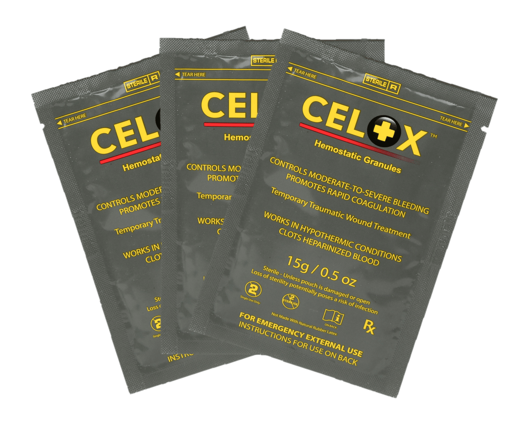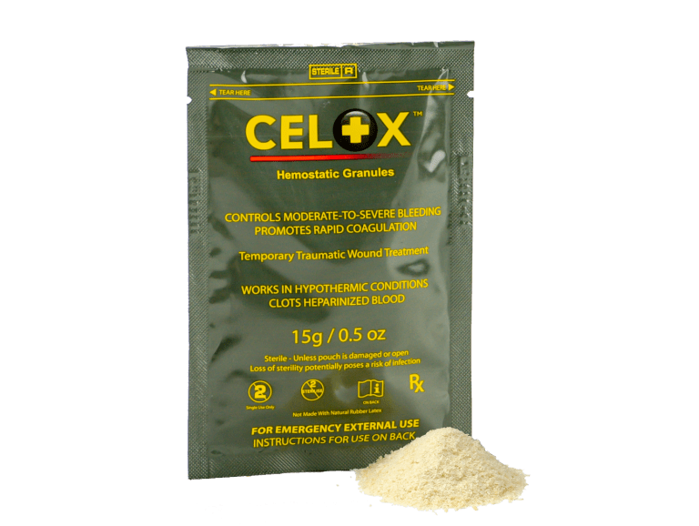Celox has also been extensively safety tested, produces no heat and is non-allergenic. The product contains no minerals and residual chitosan material breaks down in the body, making Celox the safe, proven choice.
