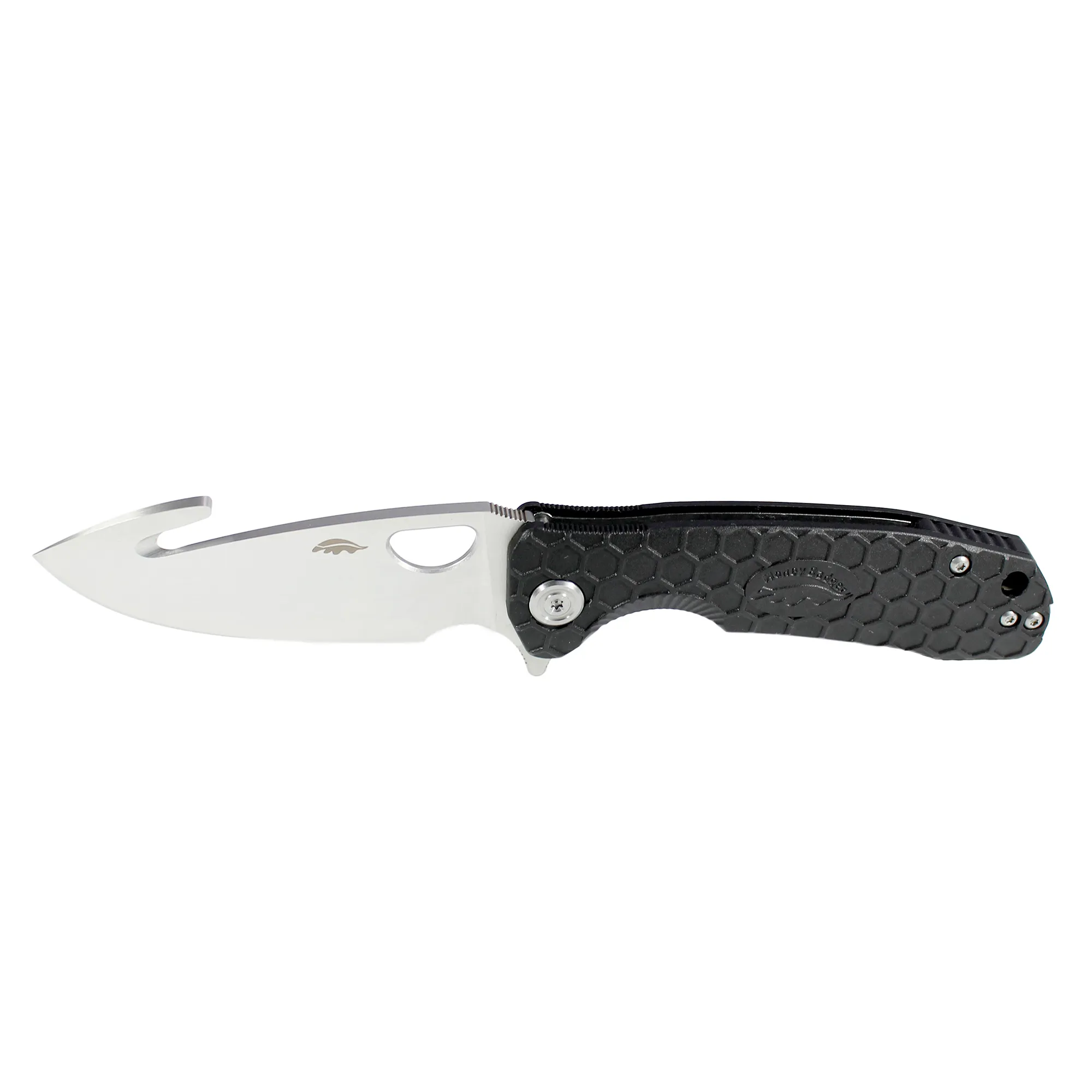 Technically, a gut hook is more of a blade feature as included on a blade, than a blade shape itself. Gut-Hooks usually appear as a small, sharpened hook-like curve that interrupts the spine as it slopes toward the point. These have one main use: field dressing wild game. The design of the hook allows hunters to cut through an animal’s skin without piercing or damaging what lies under it. Honey Badger’s specific gut-hook design features exactly the same cutting-edge profile as the drop point Flipper model, but with an added gut-hook for the field dressing of game.